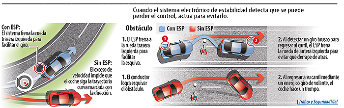 ESP son las siglas de Electronic Stability Program, Programa Electrónico de Estabilidad. Inventado por la empresa Bosch, no fue hasta 1995 cuando se fabricó por primera vez en serie gracias a la ayuda de Mercedes-Benz. Su nacimiento surgió para reducir la probabilidad de pérdida de control del vehículo en acciones como esquivar un obstáculo en la carretera o entrar en una curva con exceso de velocidad.